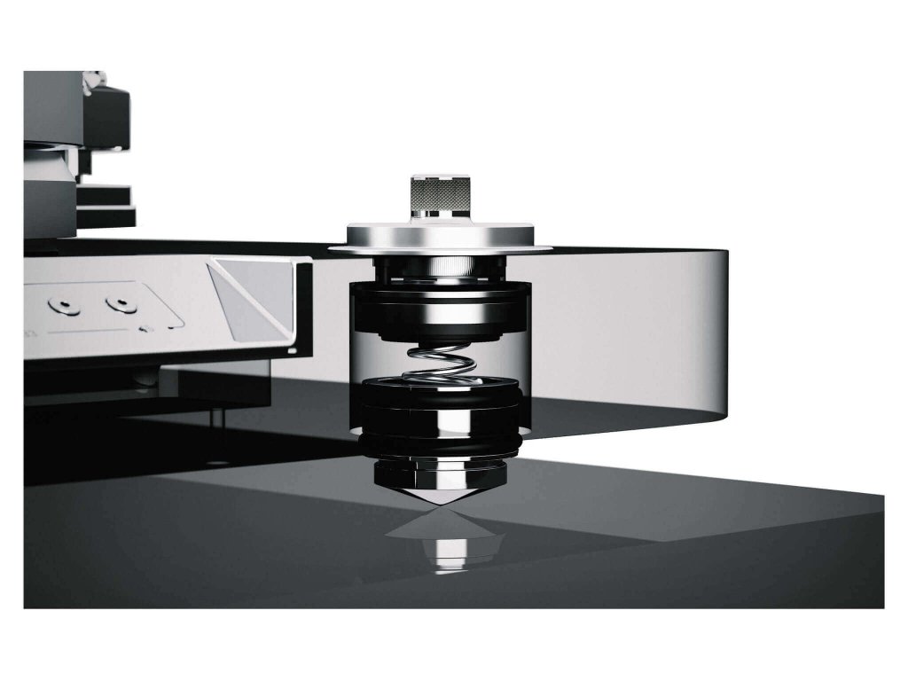Nožky s vnitřní pružinou se dokáží vhodně přizpůsobit celkové hmotnosti gramofonu Pro-Ject Signature 12.2. Použité odpružení vykazuje vynikající oddělovací efekt a navíc umožňuje upravit charakteristiky tlumení v kombinaci s ultra těžkým šasi. Kónické hroty nožek přesměrovávají jakékoli nežádoucí energie (vibrace, rezonance, hluk atd.) mimo gramofon. Výškově se snadno nastavují přímo z horní části šasi, což umožňuje dokonalé vyvážení gramofonu na ploše. Pro okamžitou vizuální kontrolu vyvážení je přímo na horní ploše integrována vodováha.