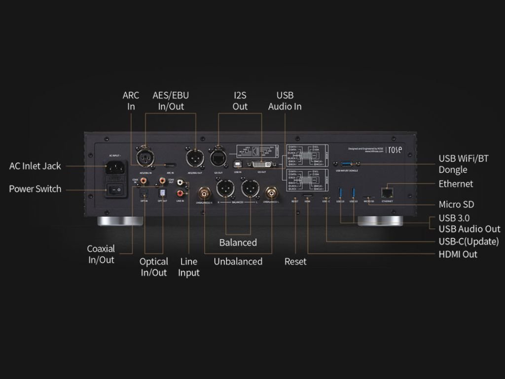 Skutečně výjimečná je možnost připojit RS150 jako digitální zdroj k externímu D/A převodníku pomocí I2S. Na zadním panelu se nachází konektor RJ45 (CMOS 3,3 V) a port DVI (režim A/B). Díky tomu je HiFi ROSE RS150B vhodný i pro použití v (polo)profesionálním prostředí.