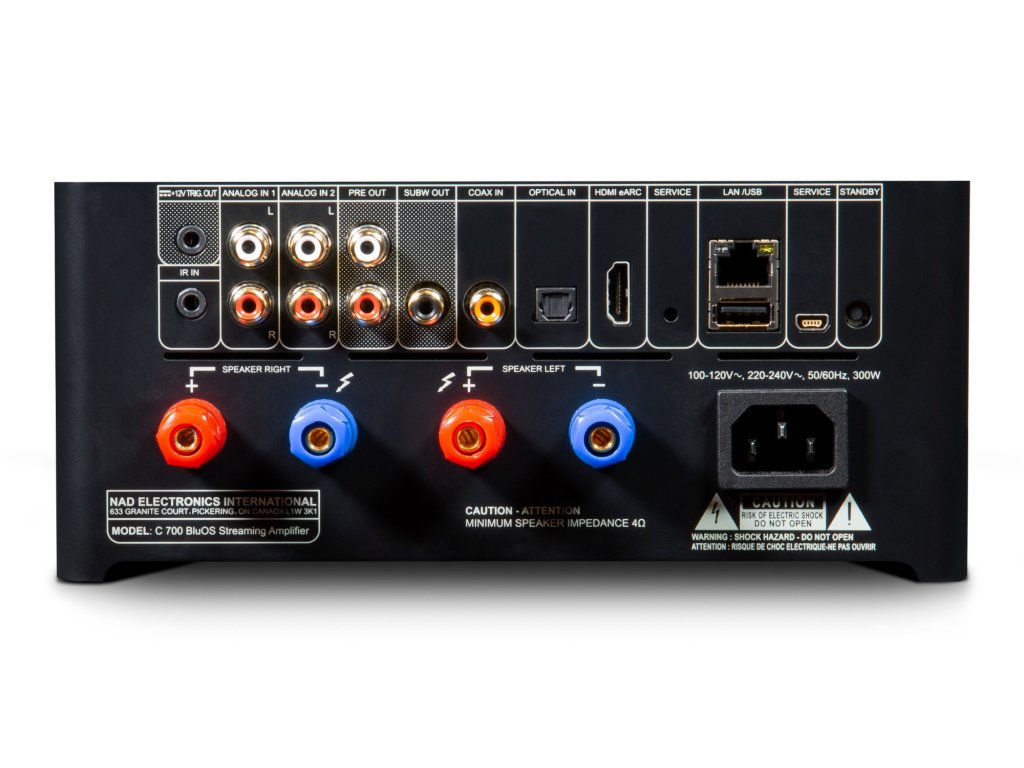 S vestavěným Ethernet a Wi-Fi připojením a síťovým streamerem, založeným na oceňované platformě BluOS má C 700 vše, co potřebujete k přehrávání hudby na svých oblíbených reprosoustavách. Aplikaci BluOS můžete použít pro výběr hudby z internetových rádií a desítek různých streamovacích služeb nebo si přehrávat hudbu z externího disku, připojeného k USB port C 700. C 700 také podporuje Spotify Connect a Tidal Connect, takže můžete ovládat přehrávání přímo z aplikací těchto služeb; AirPlay 2 umožňuje streamování hudby ze zařízení Apple a knihoven iTunes. Hudbu také můžete vybírat hlasem pomocí protokolů Amazon Alexa, Apple Siri (přes AirPlay 2) nebo Google Assistant. DAC převodník C 700 s vysokým rozlišením může přijmout streamy až 24-bit / 192 kHz. Stejně jako ostatní BluOS komponenty má C 700 plné MQA dekódování a rendering. S těmito vlastnostmi si můžete užívat bezztrátové audio ve vysokém rozlišení ze služeb jako je Amazon Music HD, Deezer, Qobuz a Tidal. NAD nabízí softwarové nástroje, které umožňují C 700 integrovat do řídicích systémů od Control4, Crestron, Elan, RTI a dalších. Integrace umožňuje ovládat přehrávání hudby spolu s dalšími domácími systémy jako je osvětlení, stínění, vytápění nebo zabezpečení.