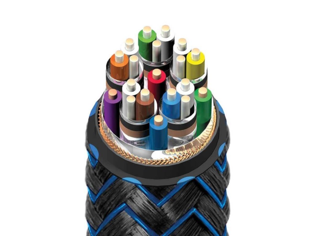 - Účinný systém pro rozptýlení šumu a vysokofrekvenčního rušení - ÚROVEŇ 5 - Dvě kovové vrstvy s mezivrstvami z uhlíku a grafenu kolem 4 párů FRL + eARC vodičů. Navíc přidáno opláštění z uhlíku pro maximalizaci účinnosti rozptylu šumu