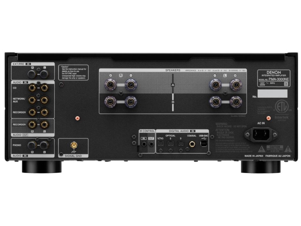 PMA-3000NE poskytuje výkon 80 W/kanál do 8 ohmů a 160 W/kanál do 4 ohmů. Jeho UHC-MOS single push-pull obvod a diferenciální dvoustupňový zesilovač řídí náročné reproduktory s výjimečnou čistotou a linearitou. Zpracování Ultra AL32 od společnosti Denon využívá interpolační algoritmy k vytvoření výstupu s vysokým rozlišením. Podporuje vstupní signály až do 384 kHz/24 bitů a umožňuje převzorkování pro hladší průběh a lepší reprodukci zvuku. Gramofonový stupeň PMA-3000NE podporuje MM i MC přenosky pro co nejvěrnější reprodukci vinylu v jakékoli sestavě. Konstrukce s vysokým zesílením a „jednoduché a přímé“ obvody minimalizují zkreslení pro čistý a detailní zvuk. Všestranné digitální připojení modelu PMA-3000NE, včetně optického a koaxiálního připojení a rozhraní USB typu B, podporuje formáty až 384 kHz/32 bitů a 11,2MHz DSD. V režimu Pure Analog jsou digitální obvody vynechány a zvuk je čistě analogový. Funkce Source Direct obchází tónové ovladače, takže signálová cesta je co nejkratší a nejčistší, což zvyšuje čistotu.