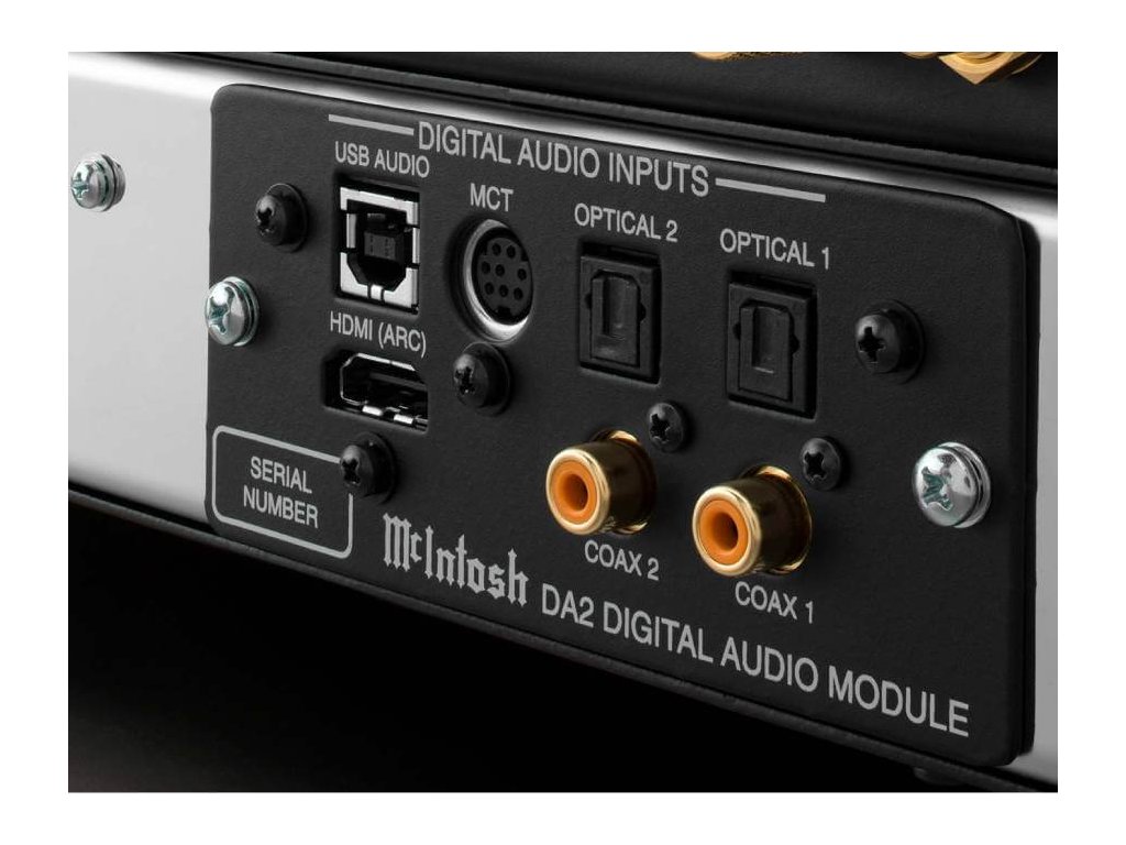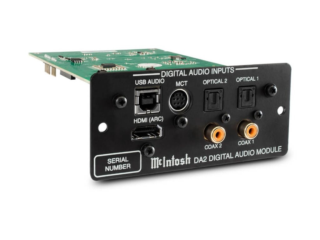 Digitální zvukový modul DA2 navazuje na DA1 a rozšiřuje jeho možnosti. Kromě toho, že má všechna stejná připojení jako DA1 (2 koaxiální, 2 optická, 1 USB a 1 MCT), je součástí DA2 nové připojení HDMI Audio Return Channel (ARC - Vstup HDMI ARC přehrává zvuk pouze z kompatibilního televizoru. Nepřenáší video do televizoru ani z něj, ani nepřehrává zvuk z jiného zdroje než z televizoru.) , které je určeno pouze pro zvuk. Díky tomu jej lze připojit k televizorům s kompatibilním výstupem HDMI (ARC) a posunout zvuk televizoru na vyšší úroveň poslechem přes domácí stereo systém. Funkce ARC může zajistit obousměrnou komunikaci mezi jednotkou vybavenou DA2 a televizorem, což umožňuje ovládání hlasitosti a funkce synchronizace rtů, které zajistí dokonalou synchronizaci zvuku a obrazu. Podporovány jsou oblíbené vícekanálové zvukové formáty Dolby® a DTS®, které budou odborně převedeny na dvoukanálový zvuk pro správné přehrávání prostřednictvím jednotky vybavené systémem DA2. Pokud je v jednotce vybavené DA2 i v televizoru povolena komunikace CEC, může dálkový ovladač televizoru ovládat výkon a hlasitost připojeného zařízení McIntosh.