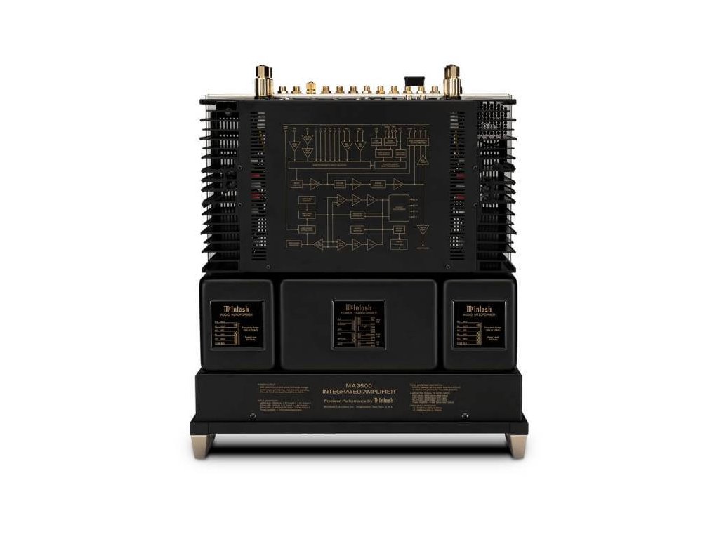 Model MA9500 je zabalen do klasického estetického kabátu McIntosh s černým skleněným předním panelem s LED osvětlením, dvojicí modrých wattmetrů reagujících na špičky, ovládacími knoflíky, osvětleným logem, hliníkovými koncovkami se zabudovanými úchyty a krásným šasi z leštěné nerezové oceli.